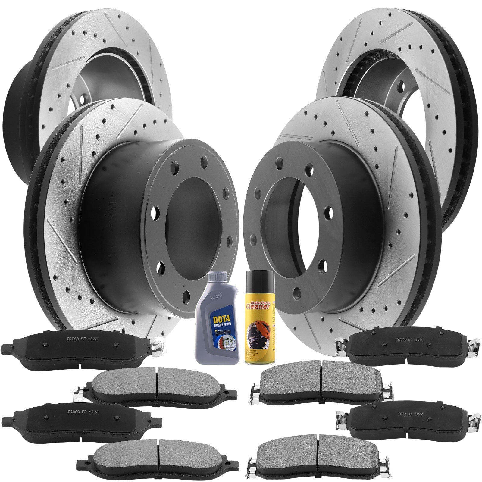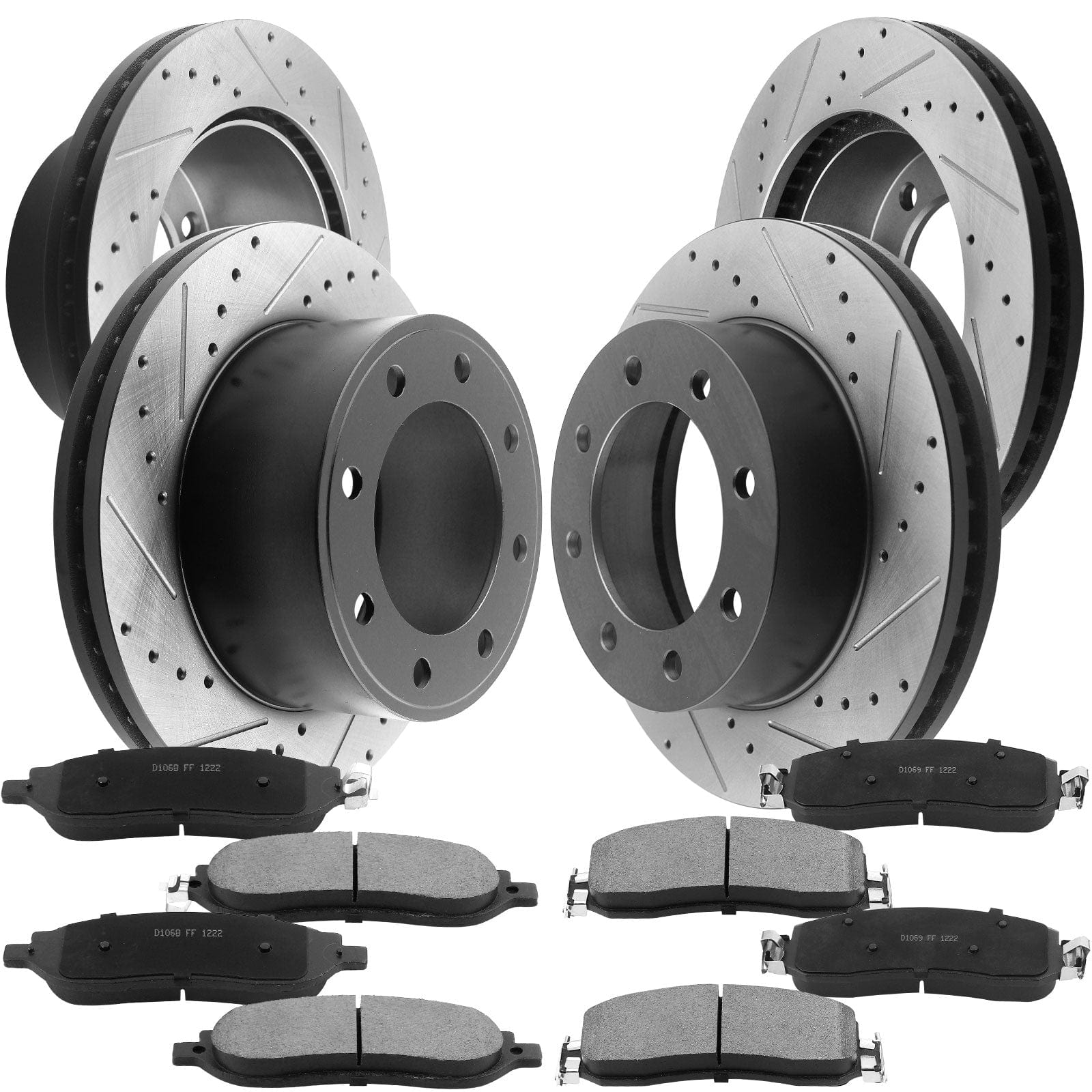 Front and Rear Drilled and Slotted Disc Brake Rotors w/Ceramic Brake Pads Fit 2005 2006 2007 Ford F-250 Super Duty(4WD or 2WD Single Rear Wheel ), 2005-2008 Ford F-350 Super Duty (SRW), 8 Lugs Counts